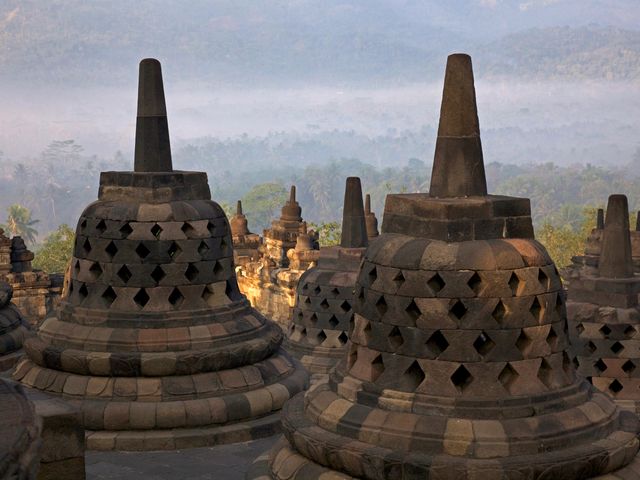 This famous Buddhist temple, dating from the 8th and 9th centuries, is located in central Java. It was built in three tiers: a pyramidal base with five concentric square terraces, the trunk of a cone with three circular platforms and, at the top, a monumental stupa. The walls and balustrades are decorated with fine low reliefs, covering a total surface area of 2,500 m2. Around the circular platforms are 72 openwork stupas, each containing a statue of the Buddha. The monument was restored with UNESCO's help in the 1970s. © UNESCO World Heritage Centre.