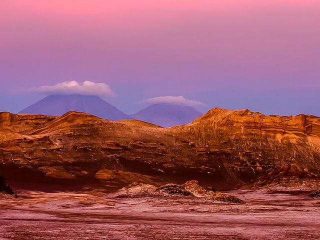 El Valle de la Luna (Valley of the Moon) is located west of San Pedro de Atacama, to the north of Chile in the Cordillera de la Sal, in the Atacama desert. It has various stone and sand formations which have been carved by wind and water. It has an impressive range of color and texture, looking somewhat similar to the surface of the moon. There are also dry lakes where the composition of salt makes a white covering layer of the area. It presents diverse saline outcrops which appear like man-made sculptures. There are also a great variety of caverns. When the sun sinks, it is painting pie tones the edges of hills and defiles, while the wind blows among the rocks and the sky passes from pink color to purple and finally black. Valle de la Luna is a part of the Reserva Nacional los Flamencos and was declared a Nature Sanctuary in 1982 for its natural environment and strange lunar landscape, from which its name is derived. The Atacama desert is also considered one of the driest places on earth, as some areas have not received a single drop of rain in hundreds of years. A prototype for a Mars rover was tested there by scientists because of the valley's dry and forbidding terrains.