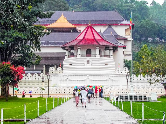 Sri Dalada Maligawa or the Temple of the Sacred Tooth Relic is a Buddhist temple in the city of Kandy, Sri Lanka. It is located in the royal palace complex of the former Kingdom of Kandy, which houses the relic of the tooth of the Buddha. Since ancient times, the relic has played an important role in local politics because it is believed that whoever holds the relic holds the governance of the country. Kandy was the last capital of the Sri Lankan kings and is a World Heritage Site mainly due to the temple. Bhikkhus of the two chapters of Malwatte and Asgiriya conduct daily worship in the inner chamber of the temple. Rituals are performed three times daily: at dawn, at noon and in the evenings. On Wednesdays there is a symbolic bathing of the relic with an herbal preparation made from scented water and fragrant flowers called Nanumura Mangallaya. This holy water is believed to contain healing powers and is distributed among those present. The temple sustained damage from bombings by Janatha Vimukthi Peramuna in 1989 and by Liberation Tigers of Tamil Eelam in 1998 but was fully restored each time.